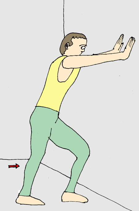 Manos apoyadas en la pared a la altura de los hombros. Llevar el peso del cuerpo hacia las manos sin mover los pies del suelo. Mantener 3 segundos y volver a la posición inicial.